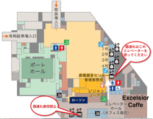 複合施設としてオフィスタワー全体の規則により 電車等でお越しになって、1階フローから会場に向かわれる方は